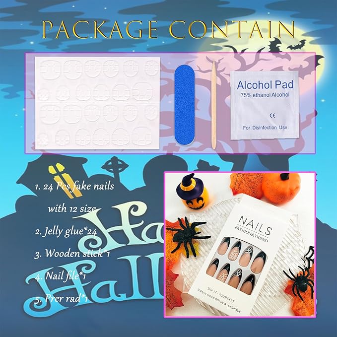 Almond Press on Nails Medium Length Black French Tip Halloween Fake Nails Full Cover Acrylic Nails Glue on Nails with Spider Web Design False Nails Glossy Stick on Nails for Women Girls 24 Pcs