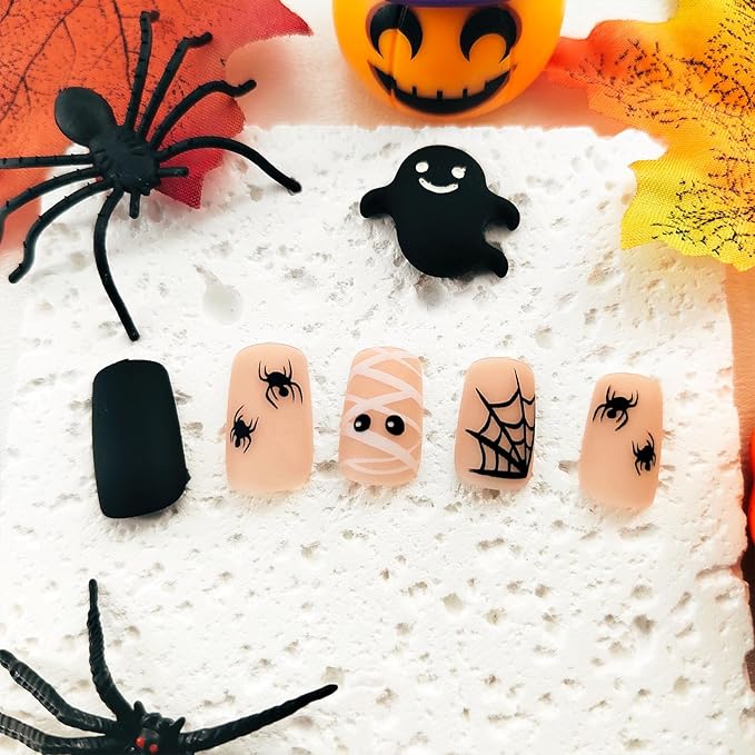 Halloween Press on Nails Medium Square Fake Nails Matte Glue on nails Nude False Nails with Cute Mummy Spiders Webs Design Halloween Nails Black Full Cover Stick on Nails for Women Girls 24 Pcs