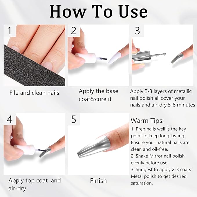 - Mirror Effect: Special metal mirror texture, after applying it, the nails will show a reflective mirror effect, making your nails beautiful and charming. Note: this is a metallic finger nail polish, not gel polish. No cure is required when using it.