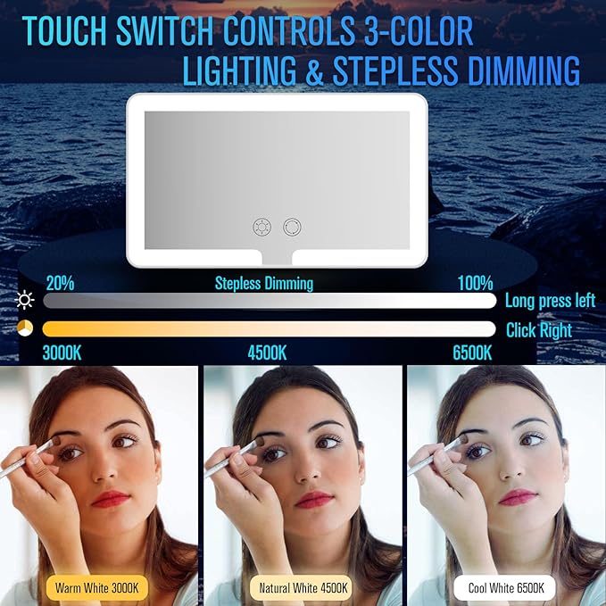 - 【3-color Dimmable Lighting】This LED car vanity mirror has 36 white LEDs and 36 warm LEDs, so it can output three color temperatures of 3000K, 4500K, and 6500K, and the output brightness is 6 times that of ordinary car makeup mirrors. The stepless dimming function allows you to adjust the light brightness from 20-100%, giving you the most comfortable lighting environment and ensuring your makeup is more perfect.