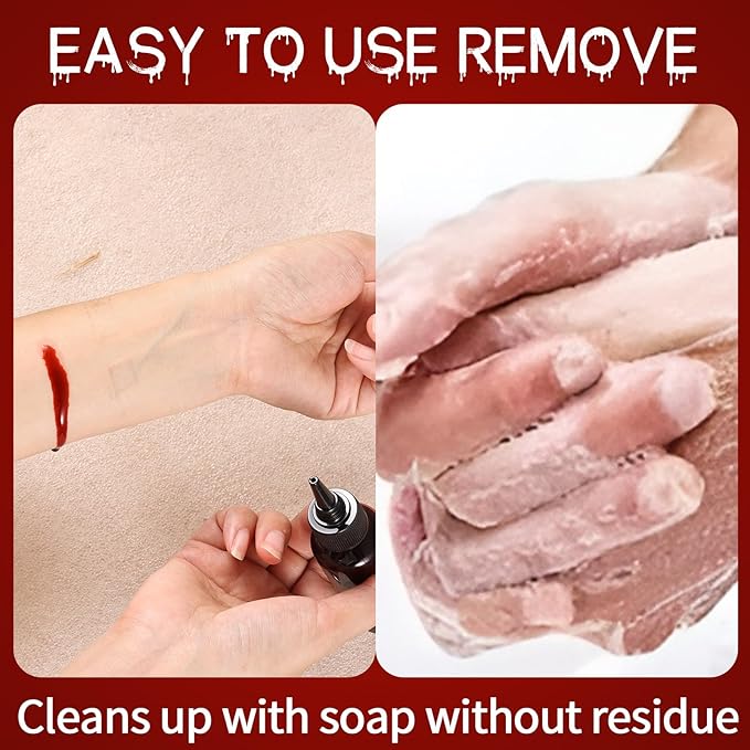 - Easy to use: Can be used anywhere for a realistic bloody effect; Spray to body for face, arms and legs or the cloth;makeup, zombie costumes, props, and sets.