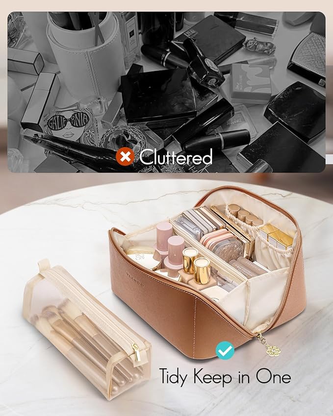 Vlando Travel Makeup Bag,Brown Leather Make up Bag,Portable Toiletry Bag with Divider and Handle,Gifts for Women (Brown)