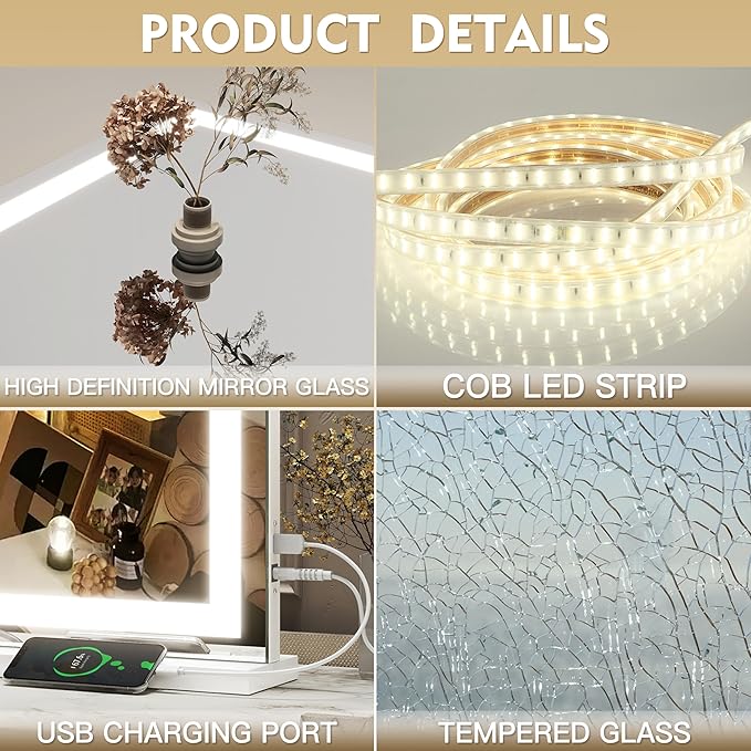 - 【USB CHARGE PORT】 The right side of the vanity mirror is equipped with USB charging ports, which can charge your smartphone, computer or other USB devices, giving you a different and convenient experience.