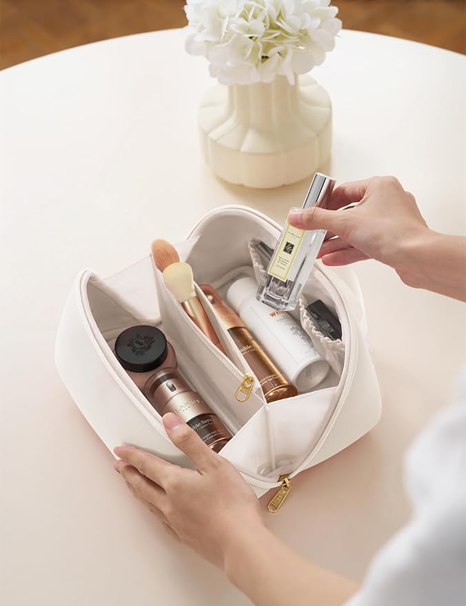 - Spacious Capacity: Measuring at 9 x 4.3 x 4.3 inches, this bag features two main compartments with four small pockets for meticulous makeup organization. The two large compartments effortlessly accommodate travel-size toiletries and sizable skincare products, while the side pockets securely hold items like concealers, lipsticks, and other travel must-haves.