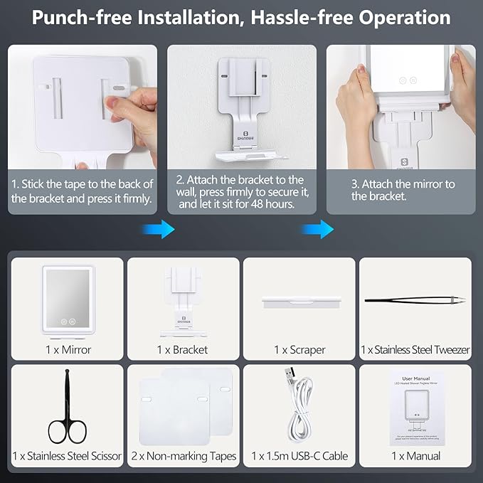Heated Shower Mirror Fogless for Shaving, 3 Colors Stepless Dimmable Lights Fogless Mirror for Shower, Rechargeable Anti Fog Shaving Mirror for Shower with Razor Holder, Light Memory Function, White