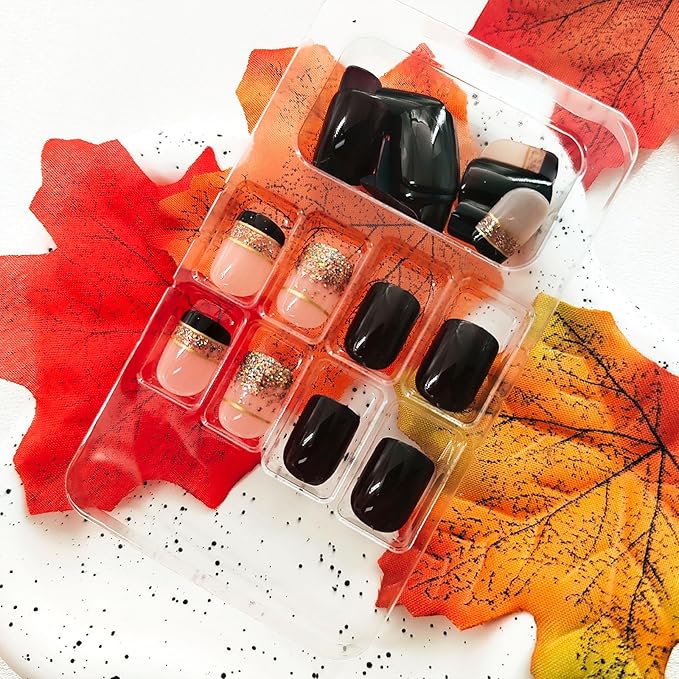 Fall Press on Nails Square Short Brown French Tip Nails Press Ons 24 Pcs Glossy Glitter Designs
