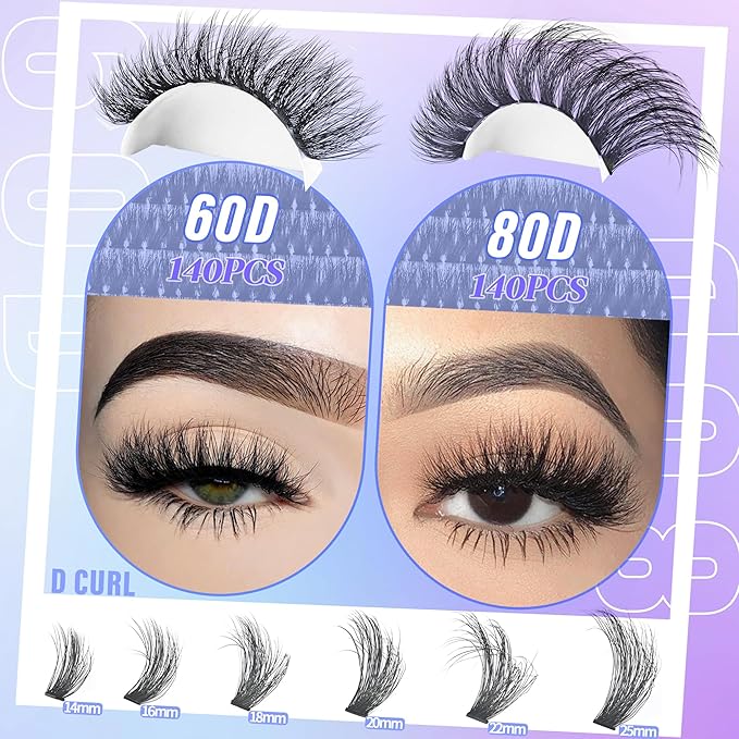 About This 【60+80D Lashes Clusters Fluffy Thick 】280pcs Volume cluster eyelashes pack with 6 length ( 14/16/18/20/22/25mm) clusters lashes,140pcs 60D... Read more