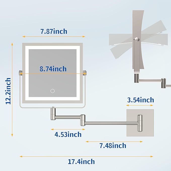 - [360°Rotation & Extendable Arm] This wall mounted vanity mirror with retractable arm allows you to adjust the arm to any angle you need. When not in use, you can fold the bathroom vanity mirror back on the wall to save space