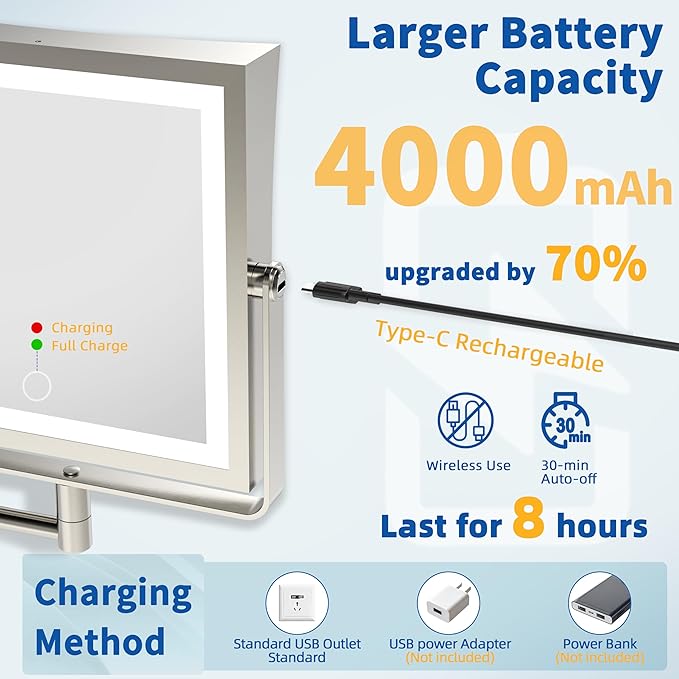 Ruacq Rechargeable Wall Mounted Makeup Mirror with Lights, Double Sided 1X/10X Magnifying Vanity Mirror with 3 Color Light, Touch Screen Dimmable, 360° Rotation Extension Foldable Arm(Brushed Nickel)