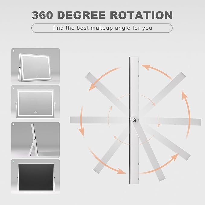 Hasipu Vanity Mirror with Lights, 16" x 12" LED Makeup Mirror with 10X Magnification, Smart Touch 3 Colors Dimmable, Adjustable Brightness, 360ยฐ Rotation, White