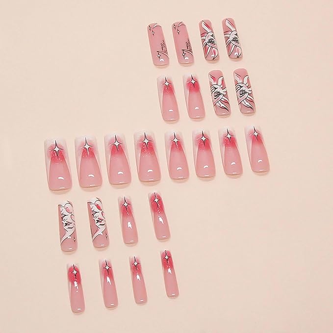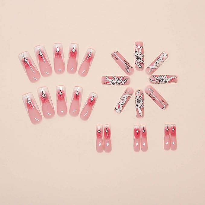 RUOKEXIN Long Square Press-On Nails - Pink Ombre, White French Tip Glitter Artificial Nails with Sun Moon Designs - 24 Cute, Glossy Glue-on Sets