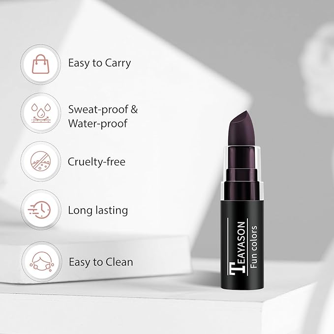 - OCCASIONS & MULTI-USE --- Purple face body paint stick/ matte purple lip-stick can be used for face, body, lips makeup. Perfect for Halloween costume makeup, party, carnival, Cosplay, SFX makeup, special effects makeup, Day of the Dead makeup, festival makeup, stage or theater performance; Various Halloween fancy makeup, such as Zombie, White Clown, Vampire, Skeleton, Skull, Catrina, Joker, Witch, Sally Face, Avatar, Cat, Corpse Bride, Goth, Alien, Ursula, Devil, Gothic, Frankenstein, Mime, Werewolf, Camouflage, Monster, Camo, Goblin and other makeup.