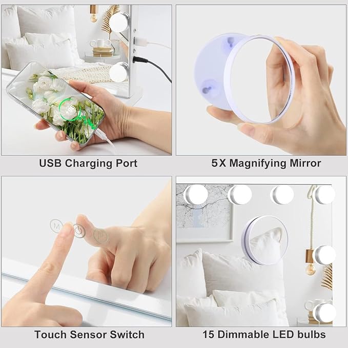 - Vanity mirror with 15 Dimmable Bulbs Lights:12 big bulbs lights along three sides of mirror will provide perfect lighting for makeup application.Made from premium flame retardant metal material and mirror glass,perfect looking and resistance for scratch