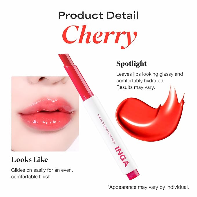 INGA Water Glow Melting Balm - Hydrating Tinted Lip Balm with Soft, Melt-On Texture, Natural Sheer, Glass-Like Finish with Non-Sticky, Lightweight Comfort (CHERRY JUICE)
