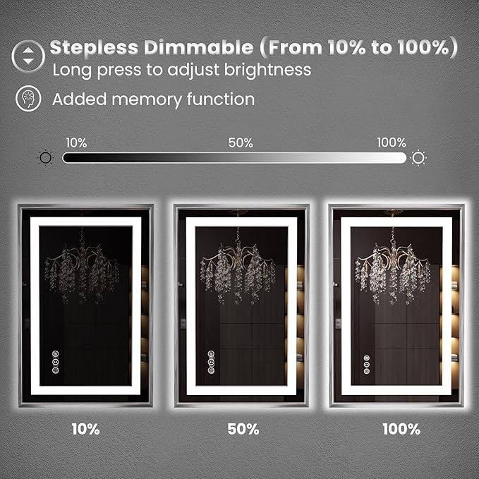 Amorho 44" X36" LED Bathroom Mirror, Brushed Nickel Framed Mirror with Front Light and Backlit, Stepless Dimmable, Anti-Fog, Shatter-Proof, Memory, 3 Colors