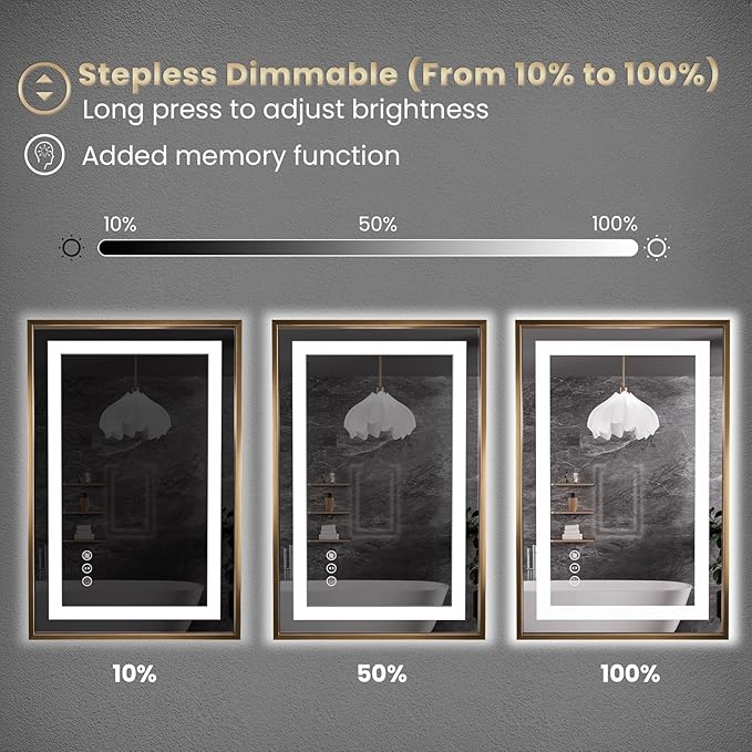 Amorho 24"X36" Gold LED Bathroom Mirror, Metal Framed Mirror with Front Light and Backlit, Stepless Dimmable, Anti-Fog, Shatter-Proof, Memory, 3 Colors