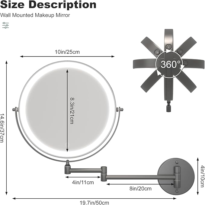 - ๐ซ๐๐ฑ๐ญ๐๐ง๐๐๐๐ฅ๐ ๐๐ซ๐ฆ ๐ฐ๐ข๐ญ๐ก ๐๐๐-๐๐๐ ๐ซ๐๐ ๐๐จ๐ญ๐๐ญ๐ข๐จ๐ง: The extendable arm reaches up to 19.7 inches, allowing you to position the mirror at the perfect angle for your routine. The swivel mirror rotates 360 degrees, offering a full range of motion to find your ideal viewing angle. When you're done, you can fold it back against the wall to save space. This versatility makes it ideal for any bathroom or vanity setup.