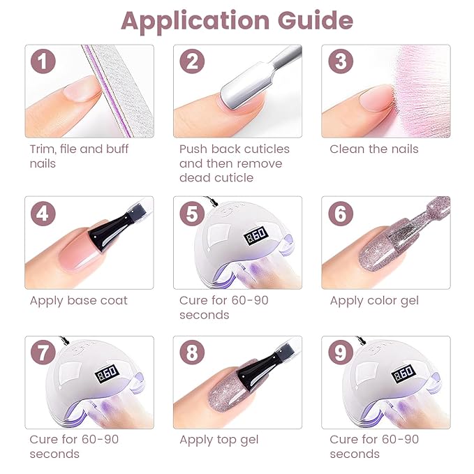 - EASY TO APPLY:This glitter rainbow gel polish is long lasting for 21+ days with perfect shine under proper application. Highly recommend a minimum of 60 seconds with a LED light and 2 minutes with a UV lamp for each layer