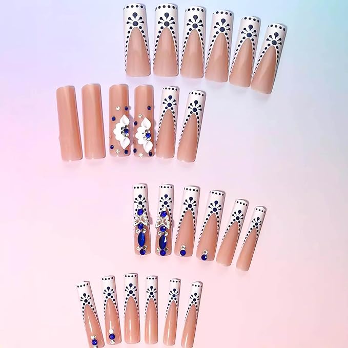 RUOKEXIN Long Nail Press ons Square Press on Nails White French Fake Nails Nude Full Cover False Nails with 3D Flower Butterfly Designs Sparkly Glue on Nails Fall Winter Stick on Nails for Women 24Pcs