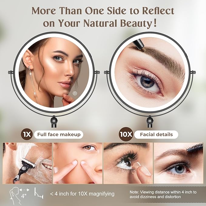 - 【Dimmable & 3 Color Lighting】This magnifying mirror with light offers white lights, warm lights, and natural lights. Simply change different light effects to satisfy your different makeup needs or test your makeup effects in different light situations by clicking the switch on mirror: white light satisfies your daily makeup need and office light situation; warm light for party or club makeup; and natural light for date or outdoor makeup.