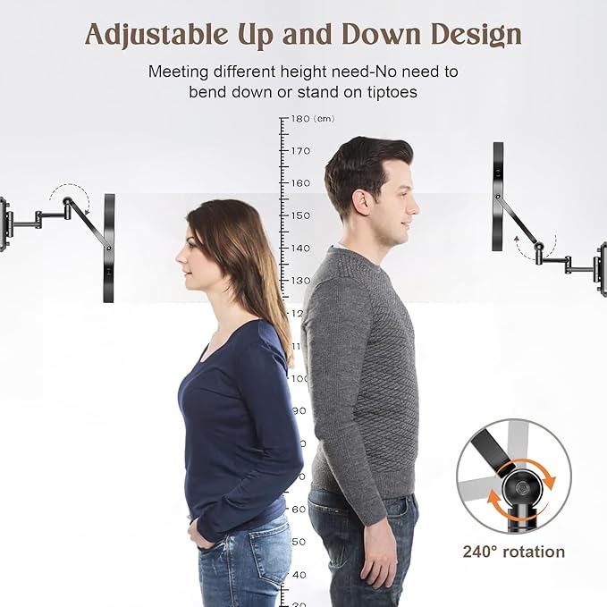 - 【Ergonomic Design Wall Mounted Mirror】Rocollos large vanity wall mirror mirror use the ergonomic design to adjust the arm, no need to bend over when makeup, No more struggling to catch the right reflection! You don't have to move your mirror anymore and this table top lighted mirror is fully foldable for saving space.