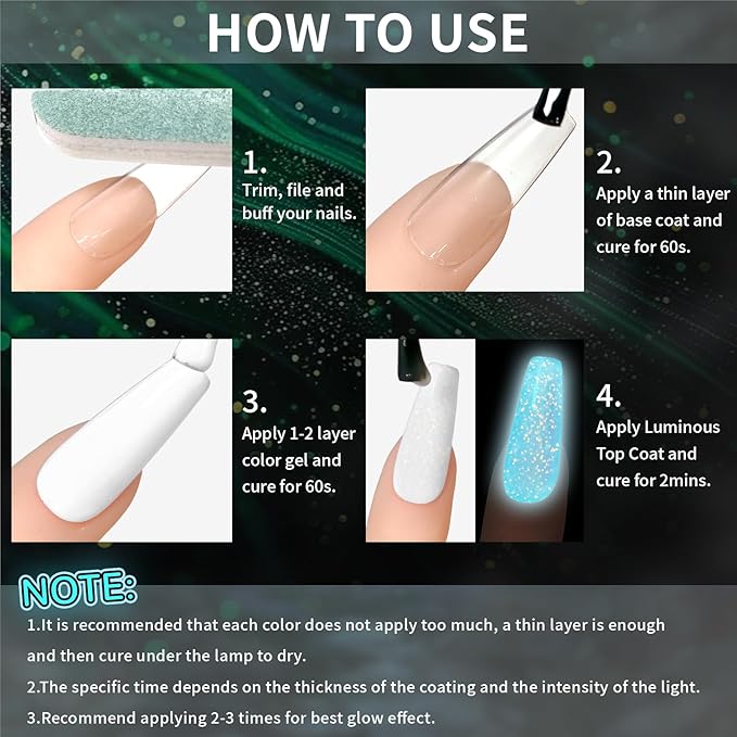 • Dry Fast: This luminous nail art needs cure, you only need to wait for 60-90s under the nail lamp to dry, and get a beautiful luminous sealing layer nail art effect. Awesome glow very bright! Neon glow nail polish is suitable for the night so apply 2 thin layers will give a better brightening effect