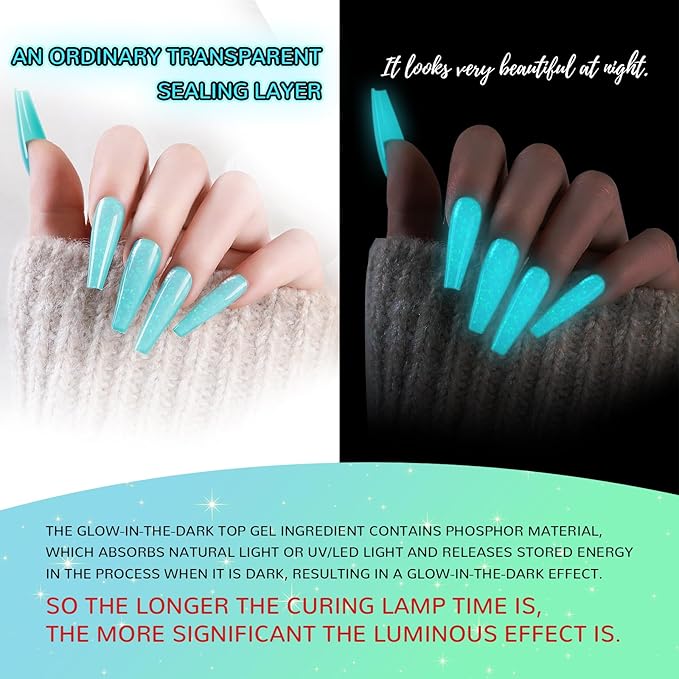 U-Shinein Glow In The Dark Gel Polish - Glitter Luminous Blue Nail Gel Top Coat with Fine glitter decoration No Wipe Long-lasting Transparent Glow UV LED Needed, Perfect for Any Festival Halloween