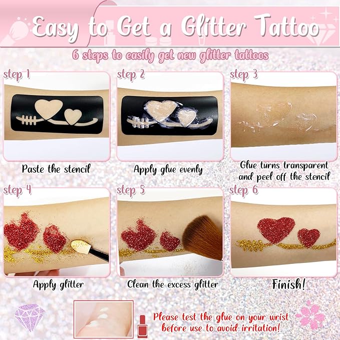 - Simple Use & Removal: Stick the stencil to the area you want to tattoo and brush on the glue. When the glue becomes slightly transparent, immediately peel off the stencil and apply glitter with a small brush. After that, press the pattern with a large brush and sweep off the excess glitter. You can use soapy water or baby wipes with gentle scrubbing to easily remove it