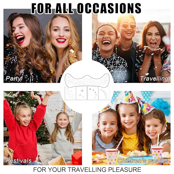 - 【Long-Lasting Cosmetic Glitter】these silver face glitter stickers are waterproof, ensuring they stay in place throughout any event, making them the perfect rave accessories for women and kids.