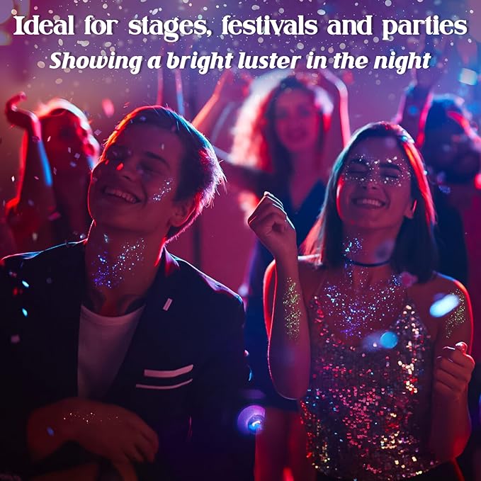 - Widely used: This facial glitter gel is used at body paint for skin, face painting, music festivals, halloween face makeup, mermaid makeup, rave festival, concerts, theme party and other occasions. Bright colors, after absorbing sufficient light and ultraviolet light, provide a sparkling effect, and can stand out and become the focus of shine in various occasions