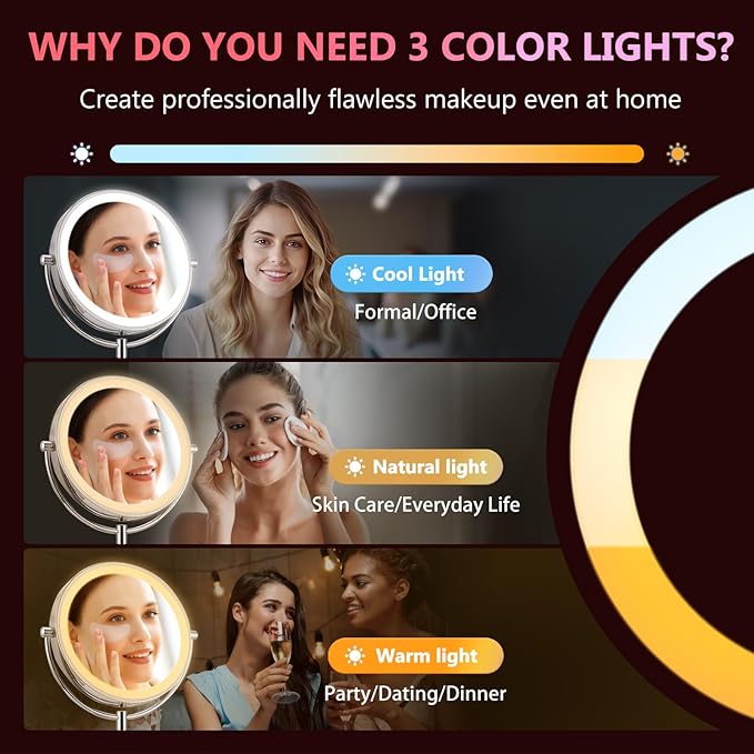 - 【3 Colors & Brightness Adjustable】This desktop makeup mirror is furnished with three distinct light sources: cool light, natural light, and warm light. This design enables users to select the most appropriate light source based on various environments and personal preferences. It supports infinite brightness adjustment, allowing users to freely adjust the brightness from 10% to 100% as required. It features an automatic memory function, capable of remembering the user's last-used brightness and color temperature settings.