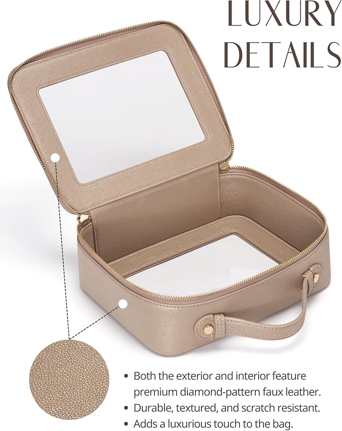 - [Premium Material and Durability] β The clear cosmetic case, both the exterior and interior, is crafted from high-grade diamond-pattern faux leather, which is highly scratch resistant, durable and exceptionally easy to keep clean. It features a smooth zipper for secure closure, and elegant light gold metal hardware accents, adding a luxurious and sophisticated touch to the bag's overall design.