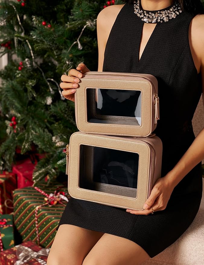 - [Premium Material and Durability] – The clear cosmetic case, both the exterior and interior, is crafted from high-grade saffiano faux leather, which is highly scratch resistant, durable and exceptionally easy to keep clean. It features a smooth zipper for secure closure, and elegant light gold metal hardware accents, adding a luxurious and sophisticated touch to the bag's overall design.