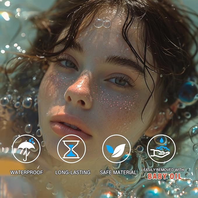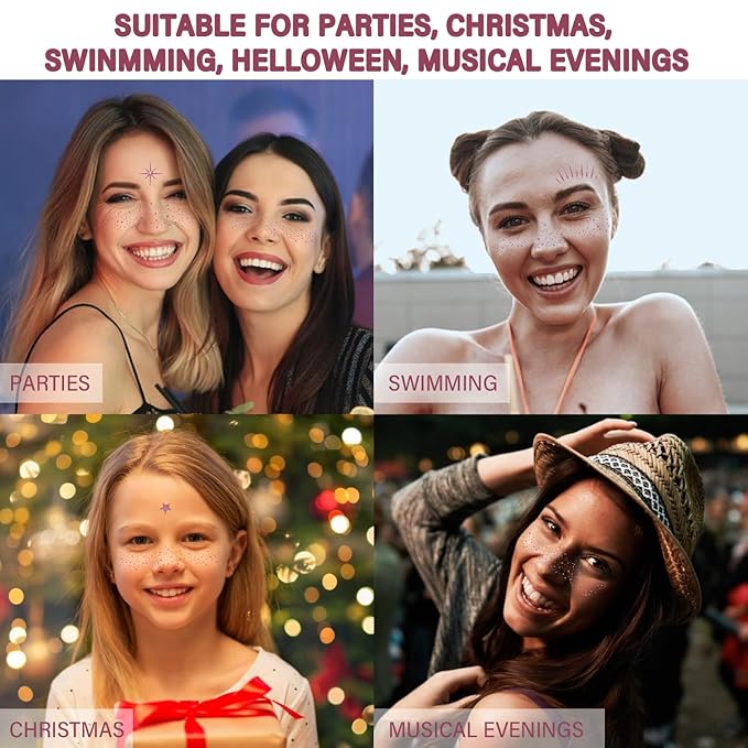 - Waterproof and Long-lasting Glitter Freckles Face Tattoo: Our makeup patches are waterproof, sweatproof and long-lasting, perfect for going out for a run or a swim, or attending a concert or birthday party, etc. They will last all day without worrying about peeling off.