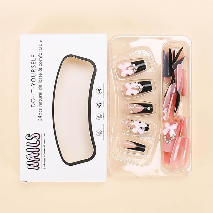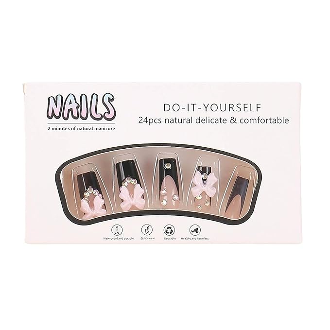 RUOKEXIN Long Square Press-on Nails: French Tip False Nails with Bow Rhinestones Designs - Pink, Black, Sparkly, Artificial 24Pcs