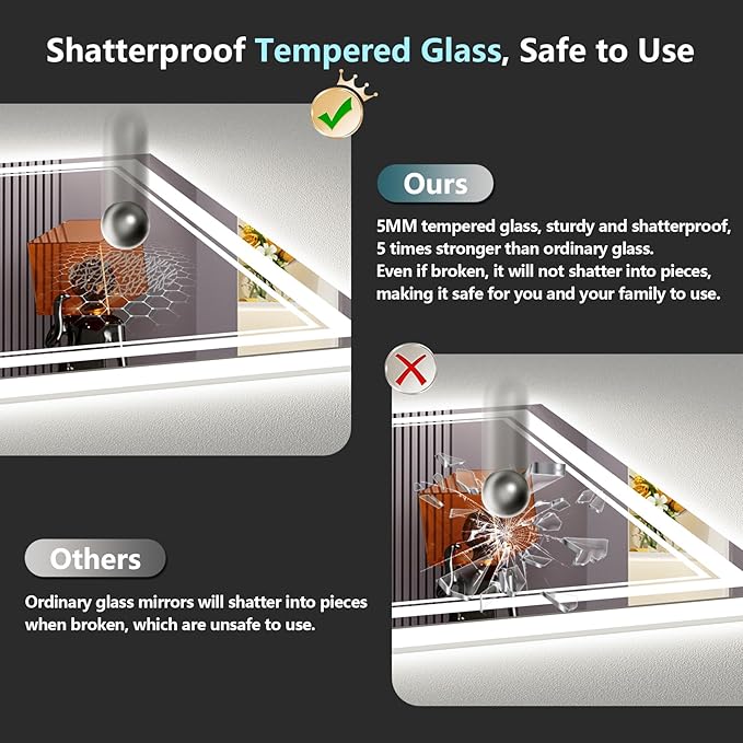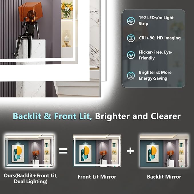 48x28 LED Bathroom Mirror with Lights, Backlit + Front Lit, Anti-Fog Lighted Vanity Mirror for Bathroom Wall, 3 Colors, Dimmable, Memory, HD Tempered Glass, Shatter-Proof, CRI>90, ETL Listed