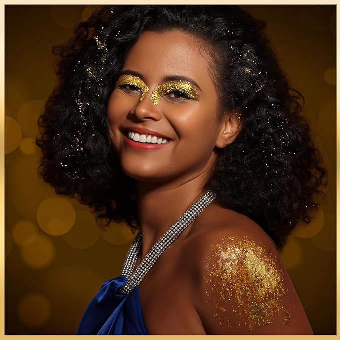 - GOLD GLITTER FOR FACE - Each glitter is securely stored in a compact container, ensuring easy storage and maintaining its freshness. The iridescent hues and vibrant gold are breathtakingly beautiful, making this set perfect for crafting festival-inspired looks for children of all ages. Plus, the handy jars fit seamlessly in your bag for on-the-go shimmer