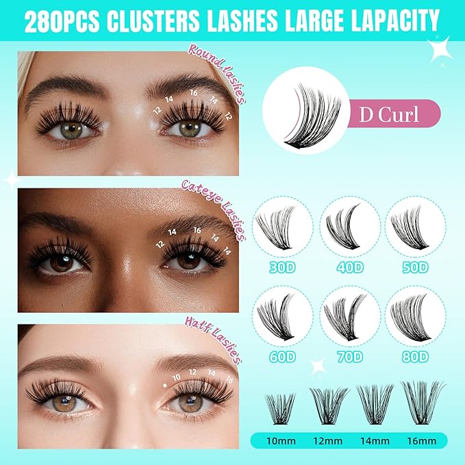 About This Wispy Lash Clusters: 280PCS 50D-14MM individual lashes in one tray. Each lash extension is processed with fine craftsmanship... Read more