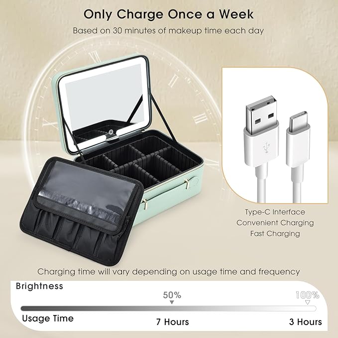 - 【ONLY CHARGE ONCE A WEEK 】- The LED mirror is equipped with a built-in 2000mAh battery, alleviating concerns about battery life during use. Based on an average daily makeup time of 30 minutes, it typically requires charging only once a week. It is important to note that charging duration may vary depending on usage time and frequency.