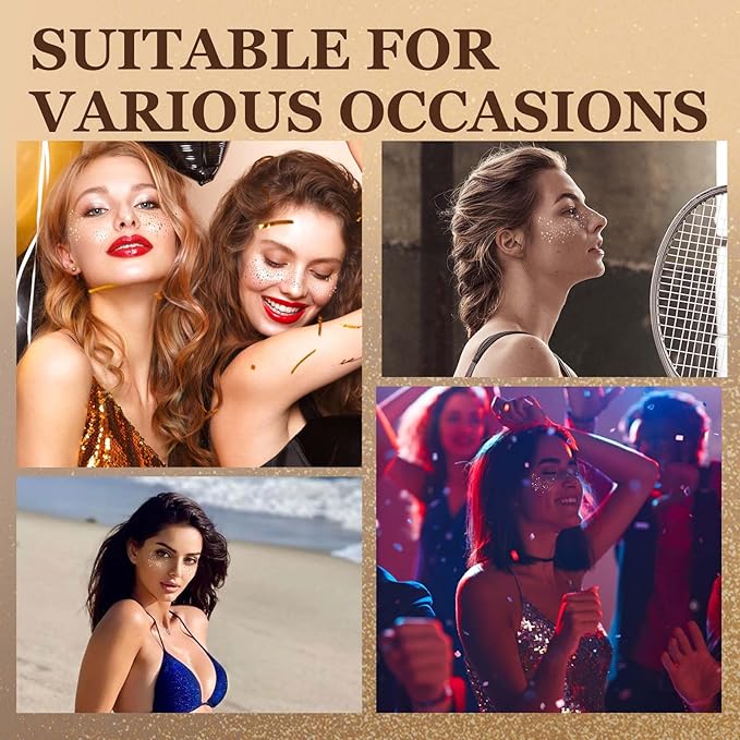 - Glitter Freckles for Every Occasion: This set includes 10 golden glitter freckles that add a touch of sparkle to your face, making you stand out at festivals, beaches, parties, and concerts.