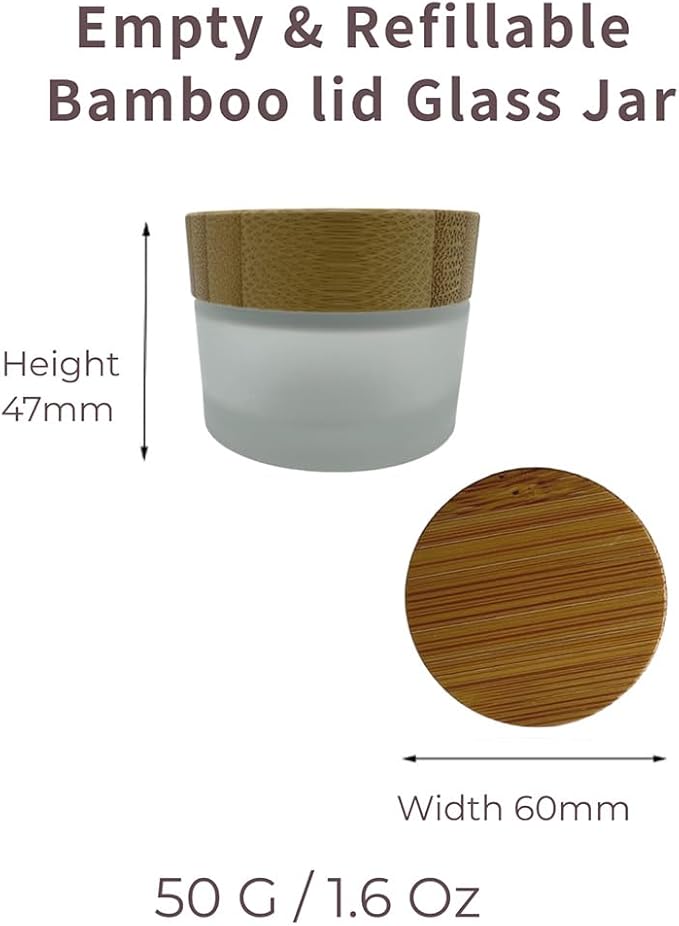 - 【VERY PRACTICAL COSMETIC CONTAINERS JAR】The empty bamboo frosted jar made by glass and natural bamboo lid.Capacity:50ml/1oz. The set comes with a set of 4 pcs 50g cream jar for cosmetic storage,The material is of luxury glass with wide mouth for better storage for facial cream, mud mask, hand cream, body butter, blusher,body scrub,essential cream and other skin care products,perfect for cosmetic items DIY making and packing.
