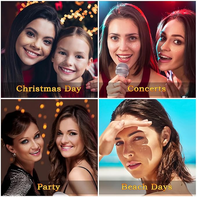 - Versatile Use: Get these face glitter freckles, designed to help you achieve a stunning look for any occasion such as on a girls trip, weeding, bride after party look, concert, Birthday party, Elsa costumes or any costume events, cosplay, homecoming dance, bachelorette party, Halloween party, music festival, summer party, cotton ball, Girls night, sleepovers, beach weekend, bachelorette/bridal parties