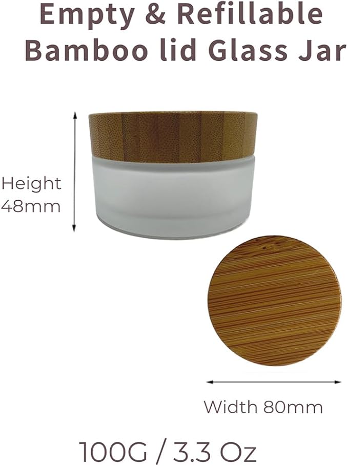 - 【VERY PRACTICAL COSMETIC CONTAINERS JAR】The empty bamboo frosted jar made by glass and natural bamboo lid.Capacity:100ml/3.3oz. The set comes with a set of 4 pcs 100g cream jar for cosmetic storage,The material is of luxury glass with wide mouth for better storage for facial cream, mud mask, hand cream, body butter, blusher,body scrub,essential cream and other skin care products,perfect for cosmetic items DIY making and packing.