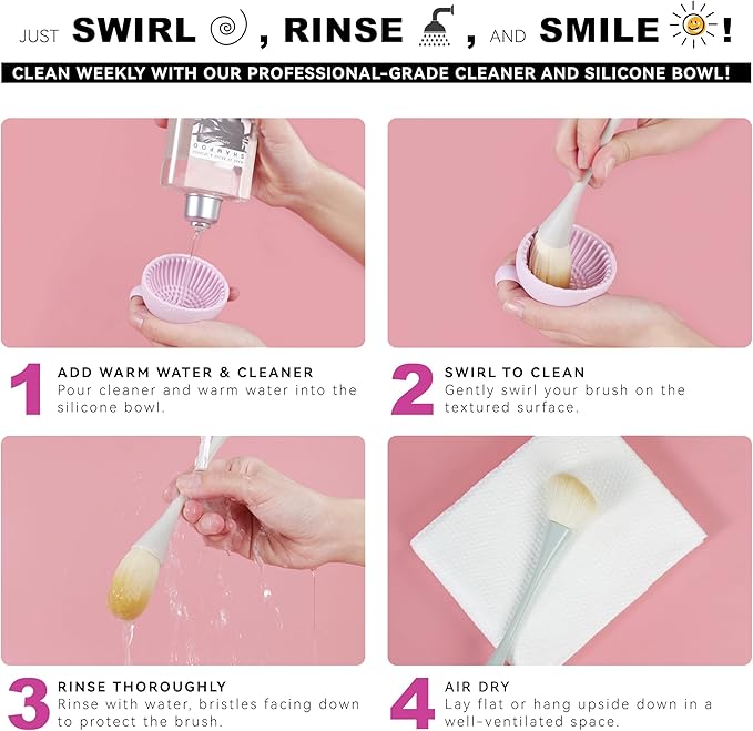 - [Clean in a Snap] Just add lukewarm water and a small amount of cleaner, swirl your brushes in the bowl, rinse with clean water, reshape, and lay flat to dry. Crafted for daily use, this quick and easy process keeps your brushes in top condition. Never run out by using Subscribe & Save, so your brushes are always fresh and ready for your next beauty routine!