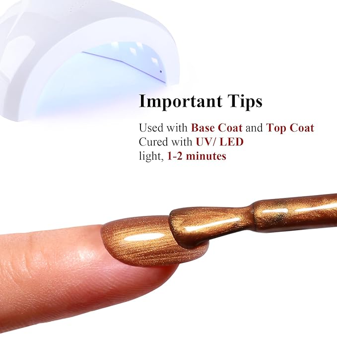 - UV Gel Polish- Cure under LED/UV light for 1-2 minutes. Base and Top coat required(not included in the package)