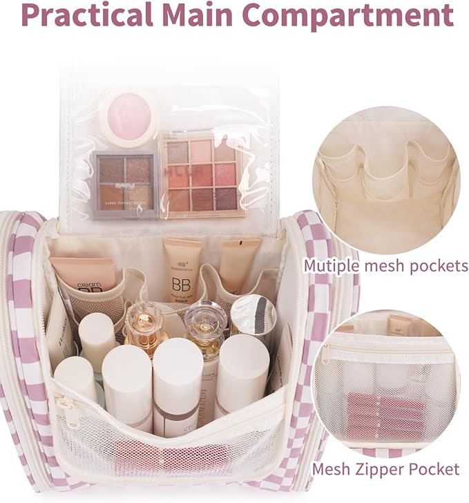 Narwey Checked Hanging Travel Toiletry Bag for Women, Travel Bag for Toiletries, Makeup Bag Organizer Cosmetic Bags Make Up Bags for Women (Dusty Rose Checkerboard)
