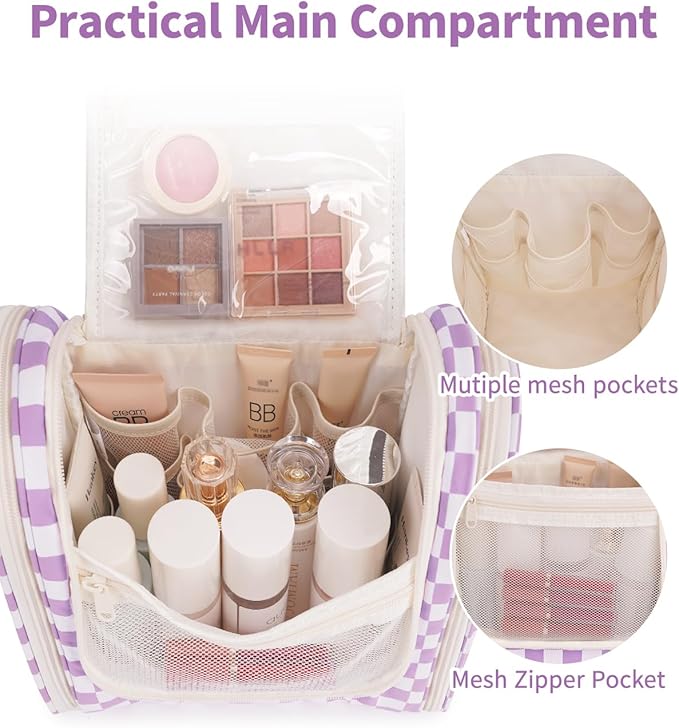 Narwey Checked Hanging Travel Toiletry Bag for Women, Travel Bag for Toiletries, Makeup Bag Organizer Cosmetic Bags Make Up Bags for Women (Purple Checkerboard)