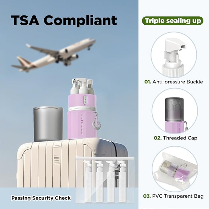 - >Leak Proof Travel Bottles: The dispenser bottle has a built-in anti-squeeze clip to prevent accidental squeeze and leakage; the 4-in-1 integrated design creates a seal when the mouthwash cup is tightened; and the transparent pouch provides extra protection and is TSA compliant.Triple protection allows you to say goodbye to liquid leakage worries, perfect for travel, hassle-free flights and gym trips!