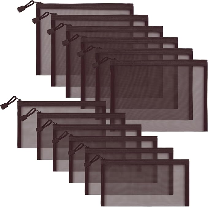 12 Pieces Zipper Nylon Mesh Pouch, Mesh Cosmetic Bags Makeup Bags Pencil Case, Multipurpose Travel Bags for Cosmetic School Office Supplies and Travel Accessories (Coffee, A5+B6)