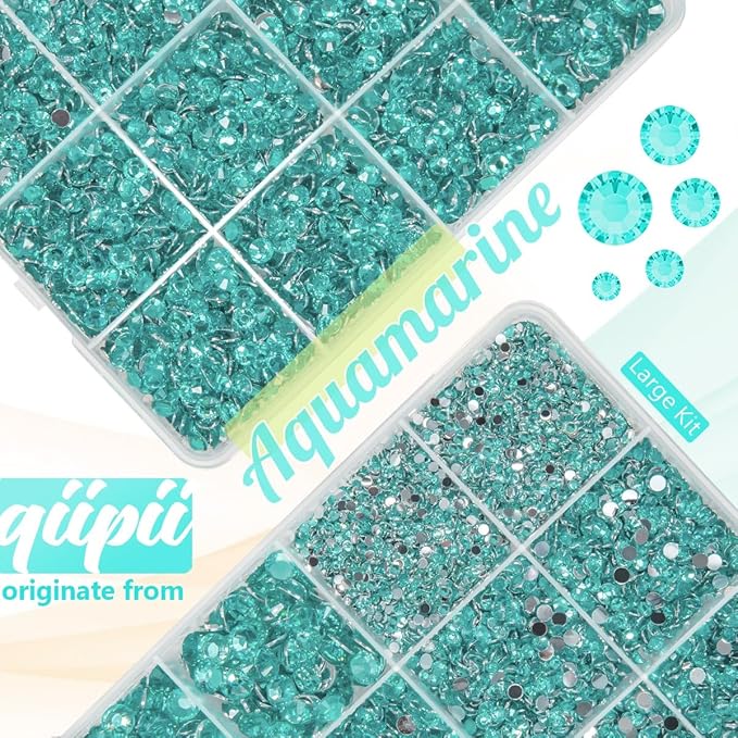 qiipii Aquamarine Resin Rhinestones w B7000 Glue for Bedazzling Crafting 2mm-6mm Lake Blue Flatback Stones Diamonds Crystals Gems Bedazzler Kit for Nails Face Eyes Makeup Tumblers Bottles Crafts Shoes